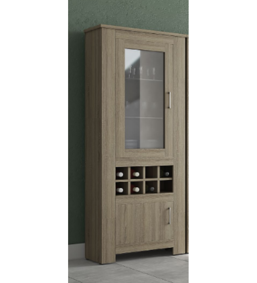 διαθέτει ντουλάπι με τζάμι στο πάνω μέρος, στη μέση 8 θέσεις για μπουκάλια και ντουλάπι κλειστό στο κάτω μέρος.