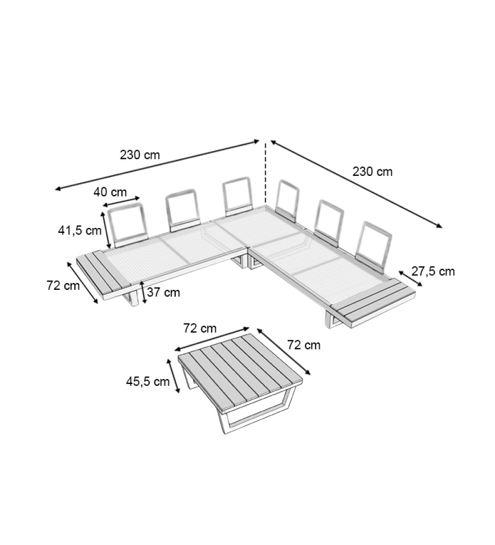 - Γωνιακός καναπές: Μήκος 230 x Βάθος 230 x Ύψος 37 εκ.