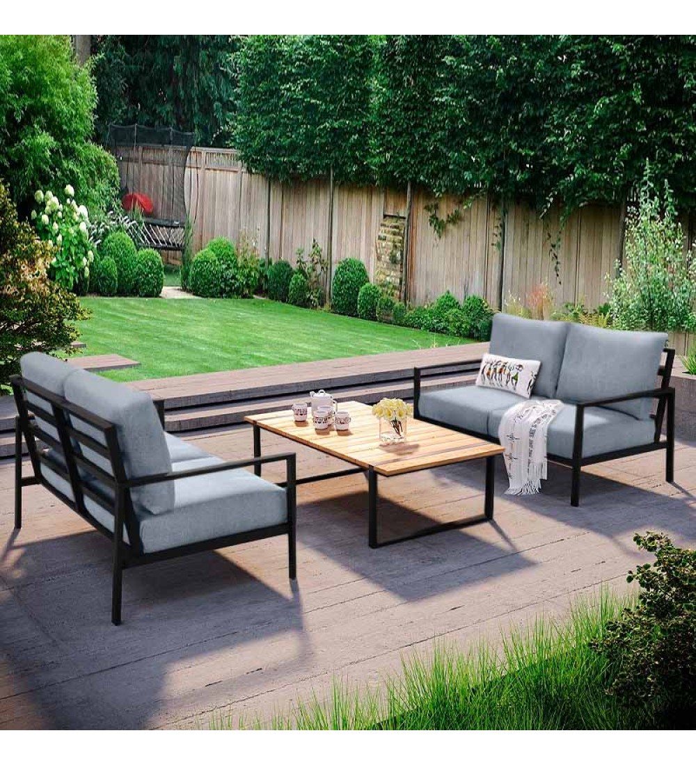 - Χρώμα: μαύρος σκελετός, τραπέζι καρυδί - μαύρο, μαξιλάρια γκρι με τόνους του μπλε