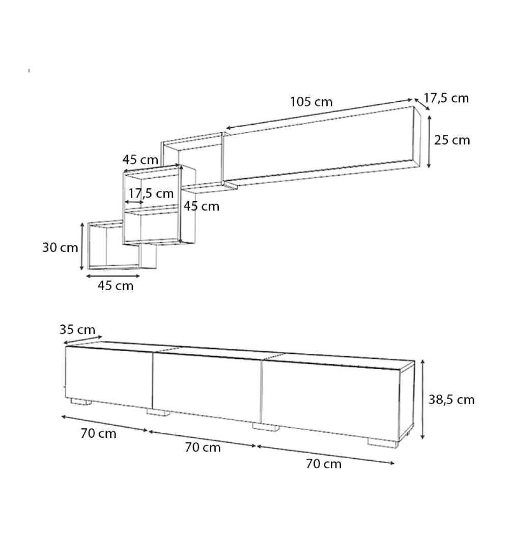 - Η σύνθεση αποτελείται από ένα έπιπλο τηλεόρασης, μία ραφιέρα τοίχου και ένα οριζόντιο μονόφυλλο ντουλάπι.