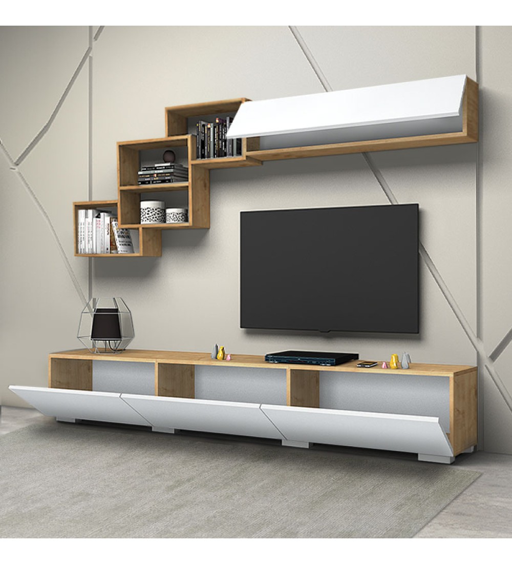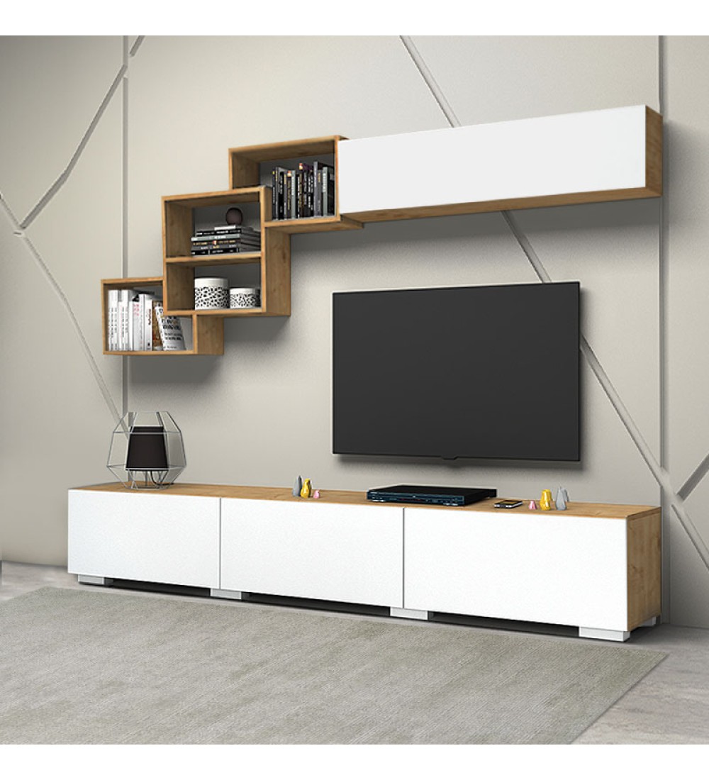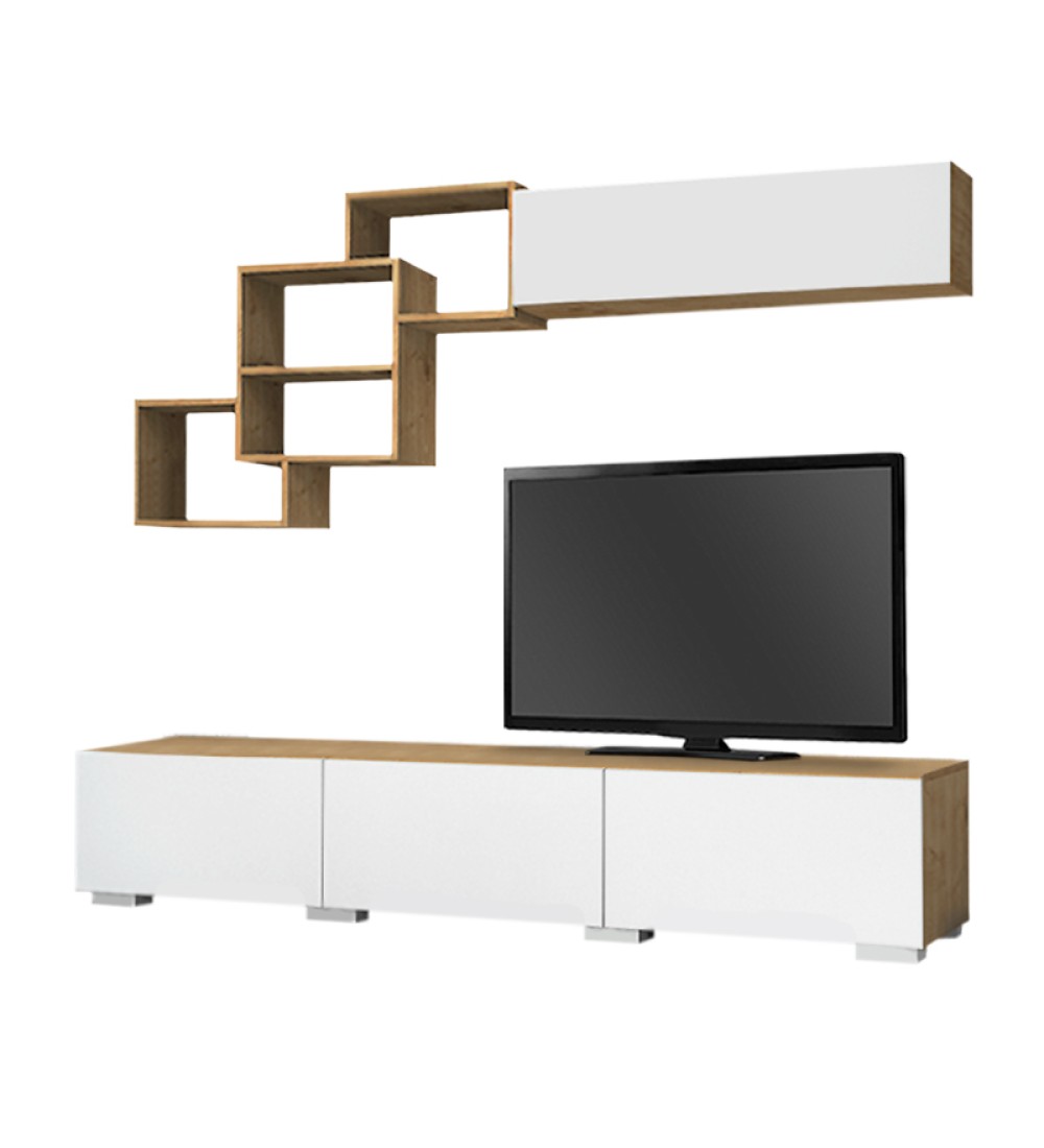 - Η σύνθεση αποτελείται από ένα έπιπλο τηλεόρασης, μία ραφιέρα τοίχου και ένα οριζόντιο μονόφυλλο ντουλάπι.