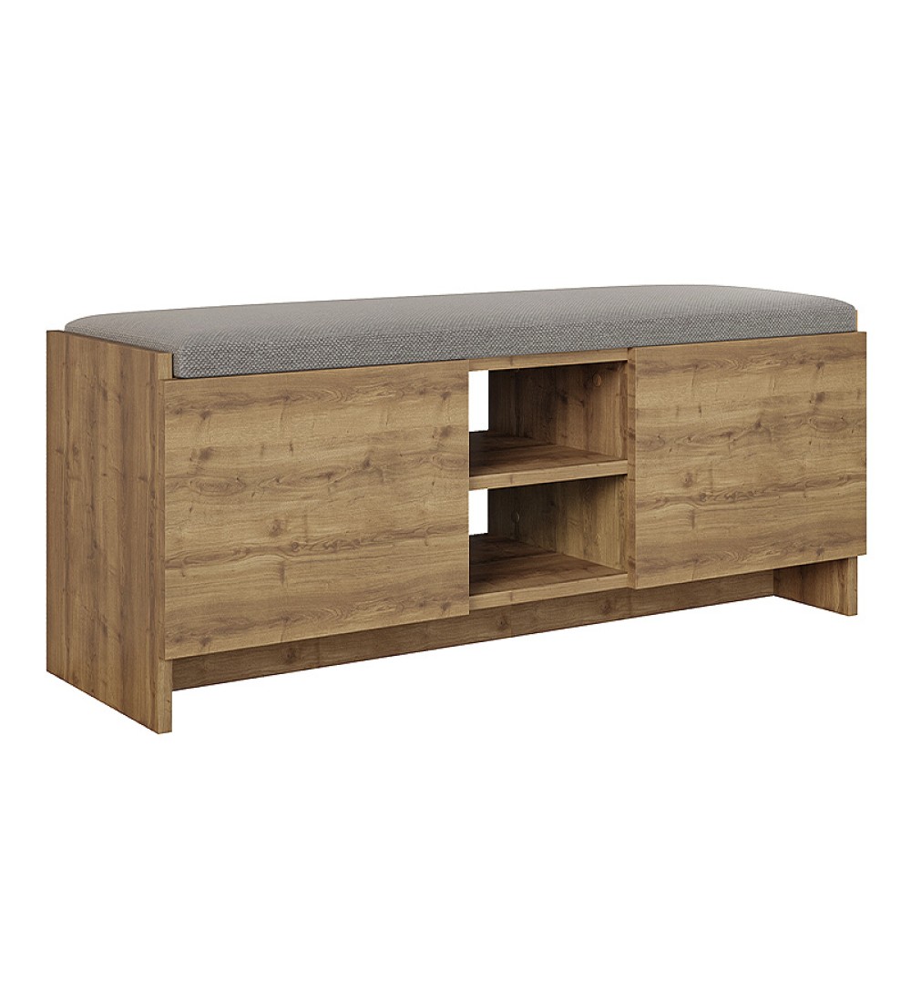 - Δεξιά κι αριστερά φέρει ντουλάπια, δύο ράφια στη μέση και κάθισμα.