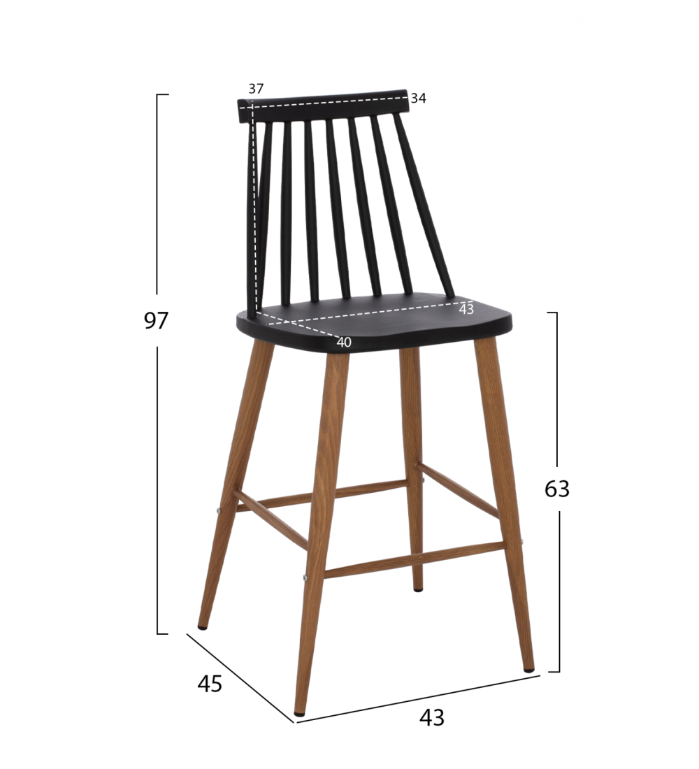 Ύψος καθίσματος: 63 εκ. - Διαστάσεις καθίσματος: 43x40 εκ. - Διαστάσεις πλάτης: 34x37 εκ.